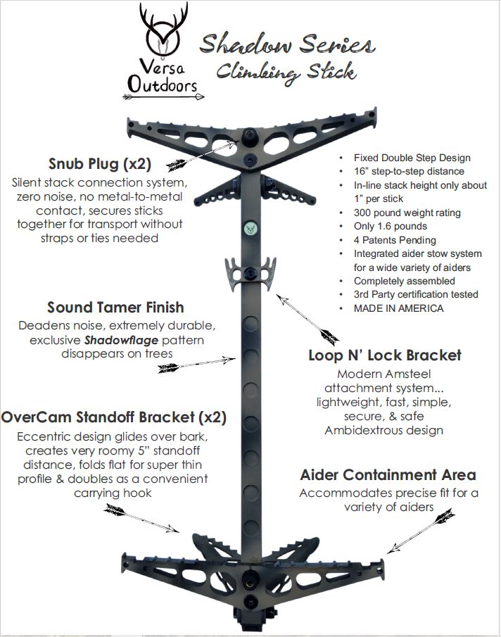 The SHADOW 16 Climbing Stick (4 patents pending) is a fixed 2-step double step climbing stick featuring new and innovative functionality. It is BUILT TO HUNT right out of the box!